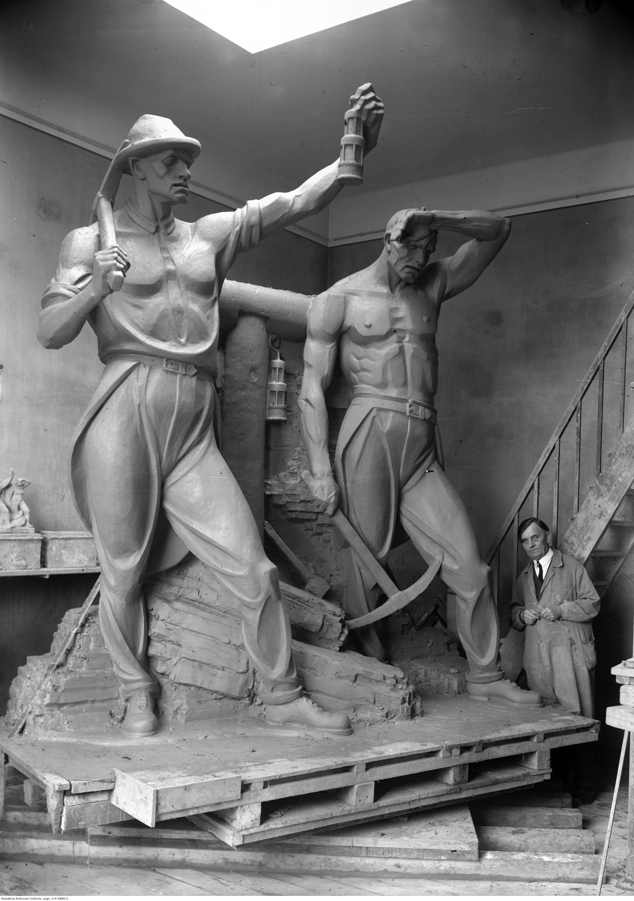 Jan Raszka w swojej pracowni przed rzeźbą górników, przeznaczoną na fronton gmachu Akademii Górniczej w Krakowie. NAC