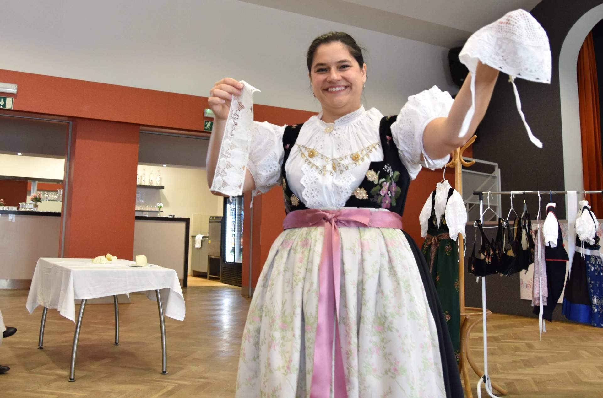 Barbara Weiser (z lewej) prowadziła wykład, a jej córka Mariola prezentowała stroje. Fot. BEATA SCHÖNWALD