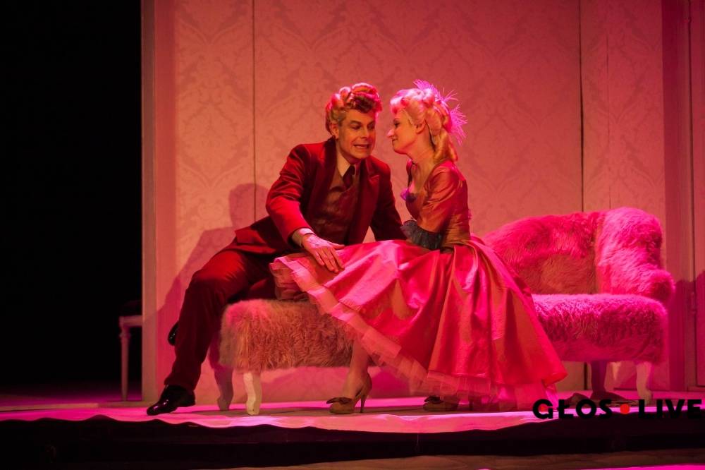 „Skąpiec” wystawiony premierowo na deskach Teatru Cieszyńskiego przez zespół Sceny Polskiej od pierwszych minut uwodzi widzów atrakcyjną scenografią. Bogdan Kokotek, odpowiedzialny za reżyserię i scenografię, zdecydował się na użycie sceny obrotowej, gdzie umieszczono dwa pokoje i front domu Harpagona. Akcja toczy się tylko w tych trzech miejscach, a zastosowanie sceny obrotowej wpływa na dynamikę przedstawienia. Aktorzy bowiem biegają z pokoju do pokoju, zataczając koła w odwrotnym kierunku do kręcącej się sceny. Wszystko tu kołuje: różowe obicia ekskluzywnych szezlongów, fikuśne fioletowe peruki, pastelowe wykwintne suknie (kostiumy: Agata Kokotek), poszczekujący zajadle żywy pies rasy chihuahua, męskie powieki wymalowane na niebiesko, mocno wypudrowane damskie fizjonomie i krzew w donicy, w której skąpy Harpagon ukrył swój skarb. Żeby było jeszcze słodziej, w pewnym momencie na scenę wjeżdża maszyna do wyrobu waty cukrowej (różowej – a jakże!) i odbiorcy z pierwszych rzędów załapują się na degustację słodkiego przysmaku na patyku. Widzowie raz po raz trzymają się za brzuchy, ale raczej nie od przypływających mdłości, co ze śmiechu. Kokotek wspierając się bowiem na komediowym mistrzostwie Moliera, piętrzy przed publicznością humor sytuacyjny. Mistrzowski żart słowny dramatu zostaje tu uzupełniony niezłą komediową grą aktorską, w kontekście której na wspomnienie zasługują scena absurdalnego przeszukiwania służącego Strzałki (Dariusz Waraksa) przez Harpagona, slapstickowe pościgi bohaterów w zwolnionym tempie między pokojami czy groteskowe zaloty starca Harpagona do młodziutkiej Marianny.