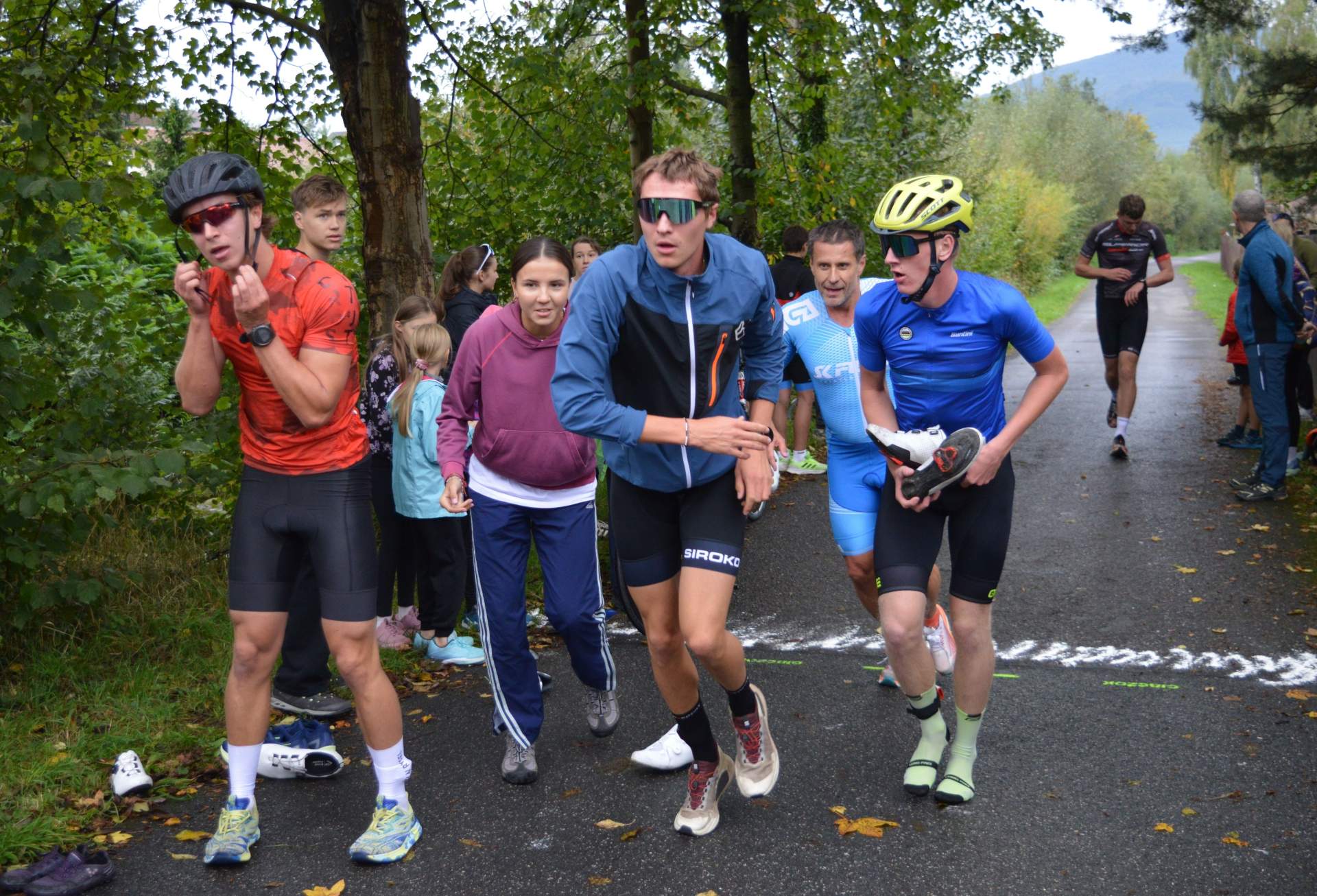 Zwycięzca Marcin Štěrba (z lewej) w grupie zawodników zmieniających obuwie z rowerów na biegi. Fot. Janusz Bittmar