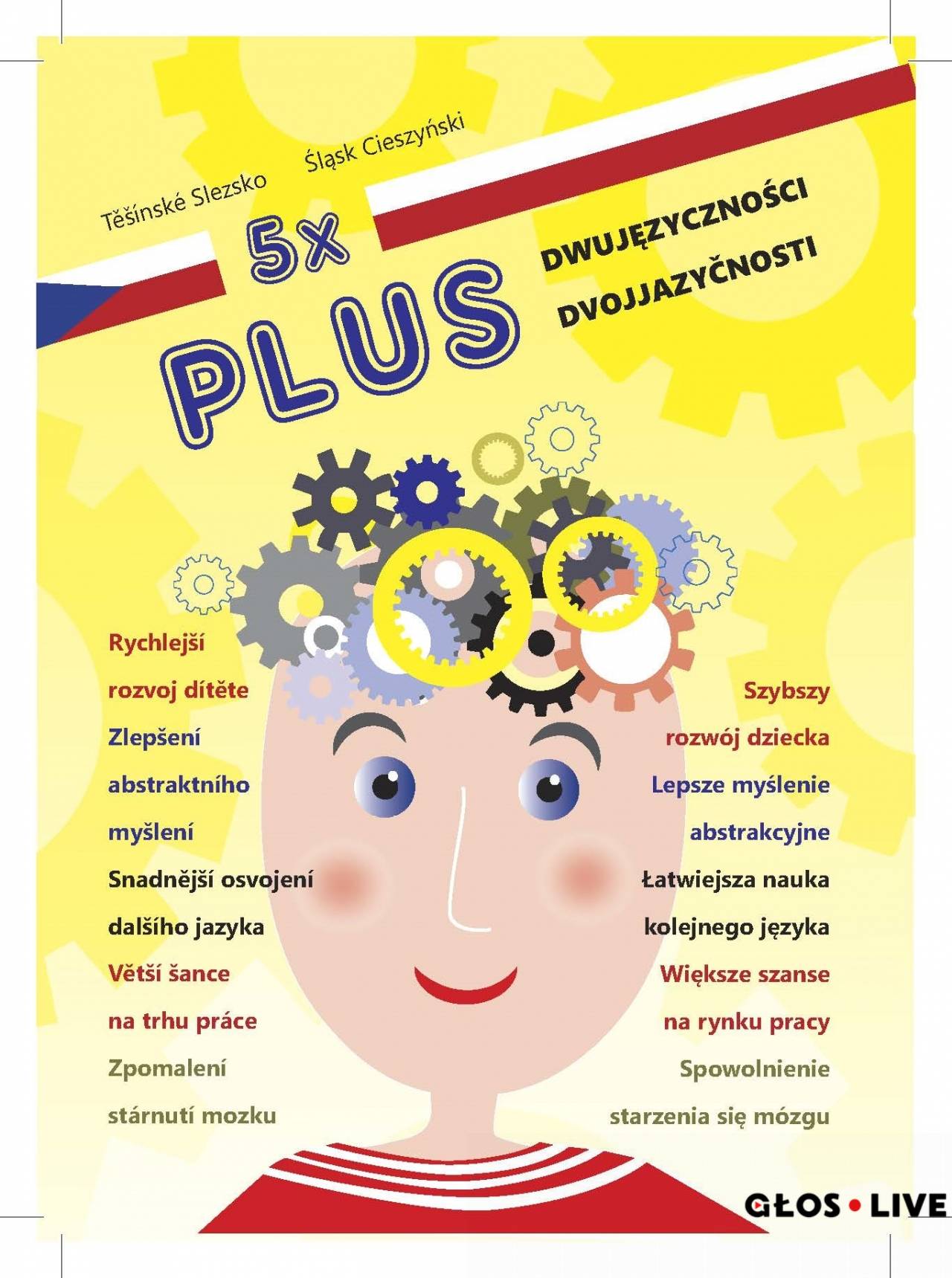 Na potrzeby kampanii przygotowano plakaty „5x plus dwujęzyczności” w formacie A2 oraz składane dwustronne ulotki „Co daje dwujęzyczność”, w których – w oparciu o badania naukowe przeprowadzane na zagranicznych uniwersytetach – tłumaczone są korzyści wynikające z dwujęzycznego kształcenia, takie jak lepszy rozwój mózgu dziecka czy też szersze możliwości na rynku pracy. Wszystkie materiały są polsko-czeskie.