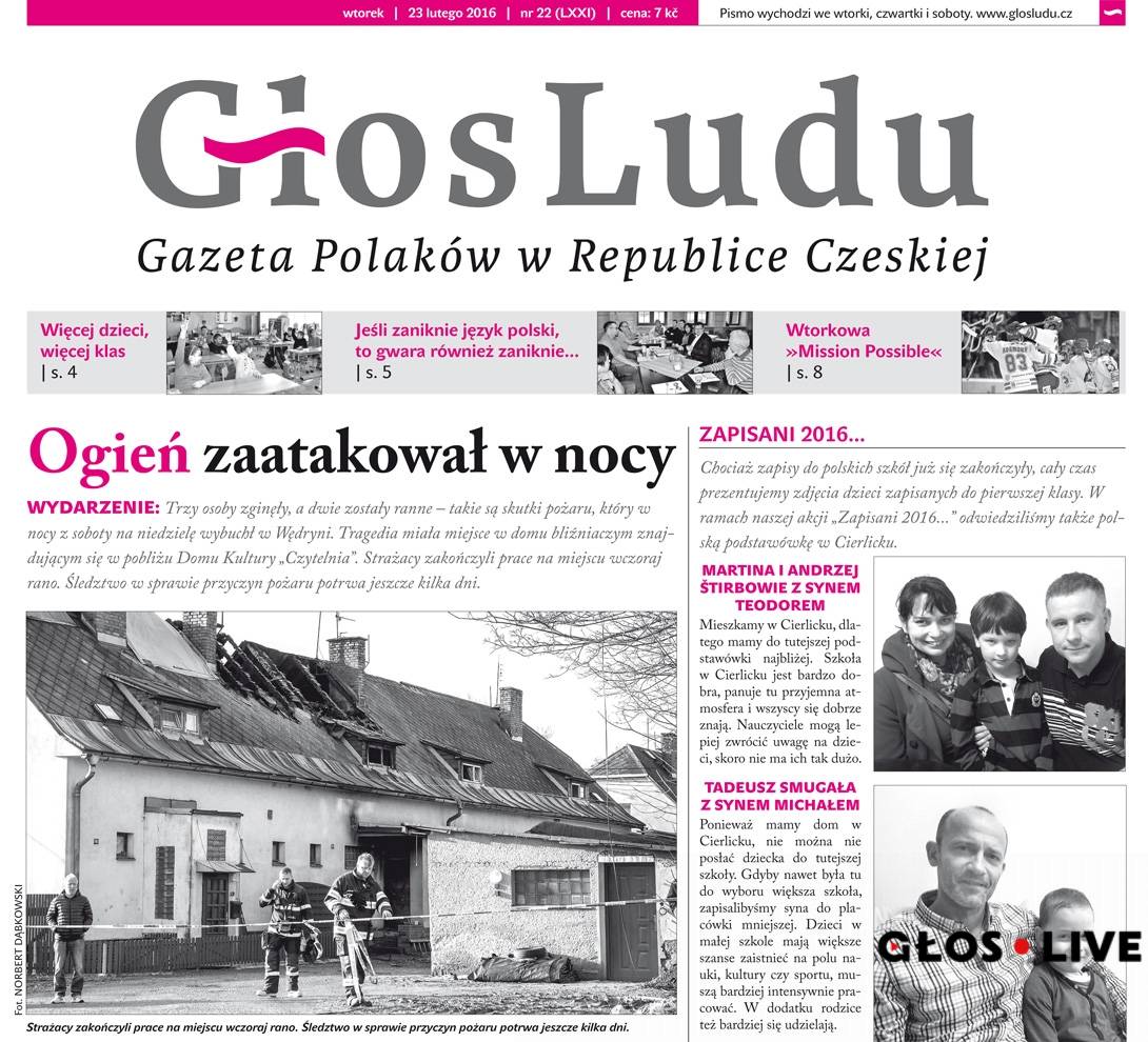 We wtorkowym „Głosie Ludu” jak zwykle znajdziecie sporą dawkę aktualności z regionu. Piszemy m.in. o sobotnich uroczystościach zorganizowanych przy pomnikach upamiętniających m.in. ofiary niemieckiej zbrodni dokonanej 20 lutego 1945 r. w Karwinie i Suchej Górnej. Recenzujemy najnowszą premierę Sceny Polskiej Teatru Cieszyńskiego, która w sobotę wystawiła nad Olzą „Złotowłosą”, czeską baśń od ponad pół wieku chętnie wystawianą przede wszystkim przez teatry... lalek. Relacjonujemy również dyskusje, jakie wywiązały się na kolejnych sejmikach gminnych w Mostach koło Jabłonkowa, Boconowicach i Bystrzycy.