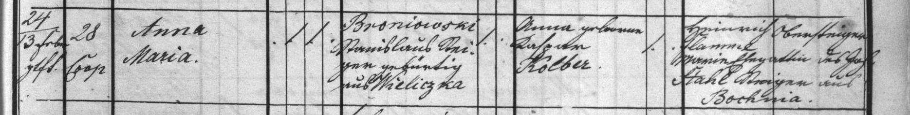 Metryka chrztu Anny Broniowskiej, urodzonej w 1875 roku w Karwinie. Źródło: Archiwum Krajowe w Opawie.